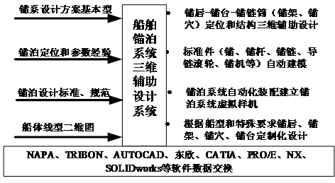 錨系三維設計軟件系統(tǒng)具有自主知識產權(著作權證書,軟著登字0627336),面向錨系設計的廣大用戶而開發(fā),為船舶設計院、船廠等用戶設計錨泊系統(tǒng)提供專用設計軟件。軟件就錨系設計提供錨系參數(shù)化輔助建模、錨系輔件參數(shù)化建模、錨標準件數(shù)據(jù)庫以及錨泊系統(tǒng)自動裝配四大模塊。本軟件可為我們開發(fā)的另一款拉錨試驗仿真軟件提供錨系設計三維模型(虛擬樣機),同時也可輸出后期用于船舶建造過程使用的生產設計圖紙(錨唇錨臺安裝坐標圖、錨唇鑄件剖面和型值點、錨臺展開圖、樣板圖、襯板剖面圖、錨鏈筒展開圖、錨穴開口位置圖等)。設計圖紙和模型可以與船舶行業(yè)通用設計軟件(TRIBON、NAPA、CATIA、PRO/E、NX、AUTOCAD、solid works、滬東東欣 軟件等)進行數(shù)據(jù)交換、輸入和輸出。